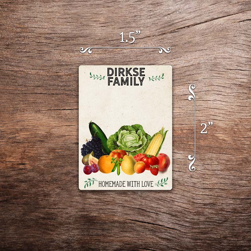 Customizable write-in label featuring antique fruit and vegetable illustrations on a vintage paper background with customizable text at the top. This photo shows a rectangular label measuring 2 inches tall by 1.5 inches wide. All text on the label is customizable.