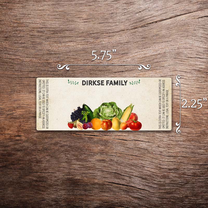 Customizable write-in label featuring antique fruit and vegetable illustrations on a vintage paper background with customizable text at the top. This photo shows a rectangular label measuring 2.25 inches tall by 5.75 inches wide. All text on the label is customizable.