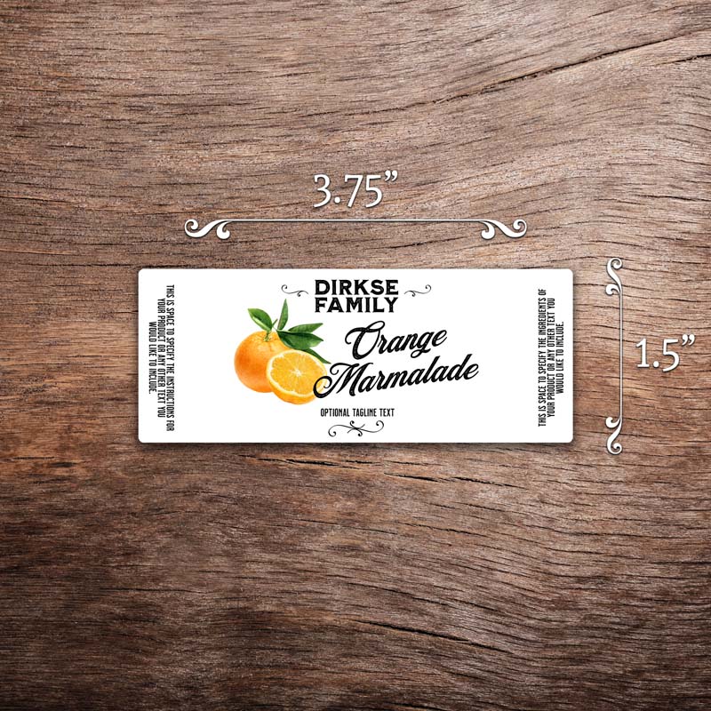 Customizable orange label featuring watercolor orange illustrations on a white background with black text. This photo shows a rectangular label measuring 1.5 inches tall by 3.75 inches wide. All text on the label is customizable.