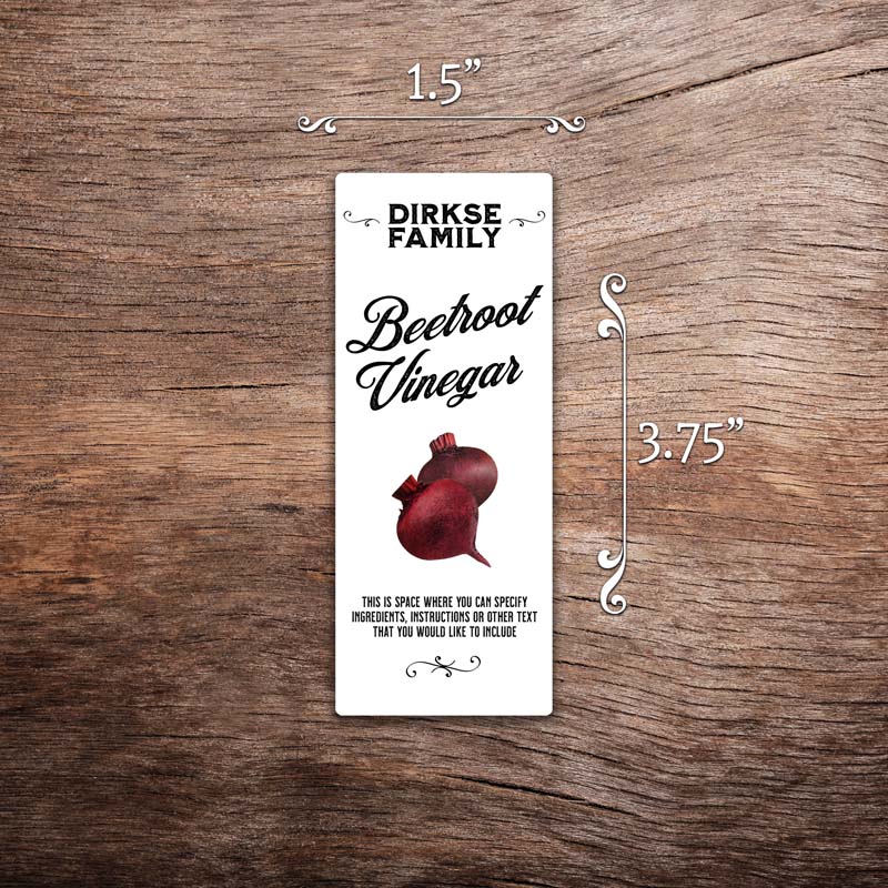 Customizable beet label featuring beetroot illustrations on a white background with black text. This photo shows a rectangular label measuring approximately 3.75 inches tall by 1.5 inches wide. All text on the label is customizable.