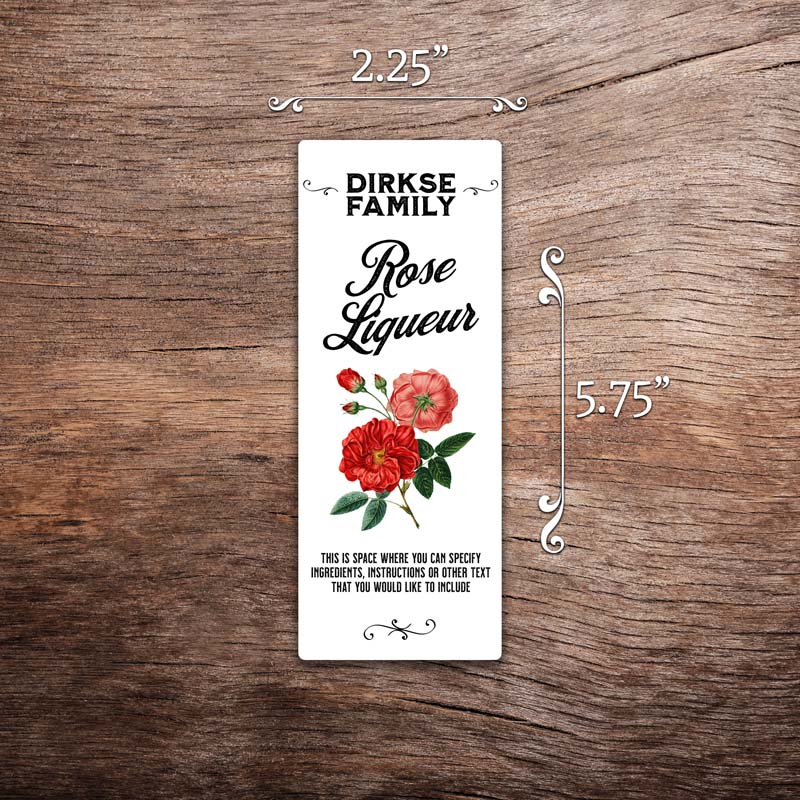 Customizable rose petal label featuring pink and red rose illustrations on a white background with black text. This photo shows a rectangular label measuring 5.75 inches tall by 2.25 inches wide. All text on the label is customizable.