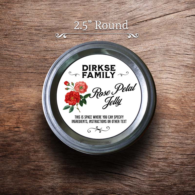Customizable rose petal label featuring pink and red rose illustrations on a white background with black text. This photo shows a round label measuring 2.5 inches. All text on the label is customizable.