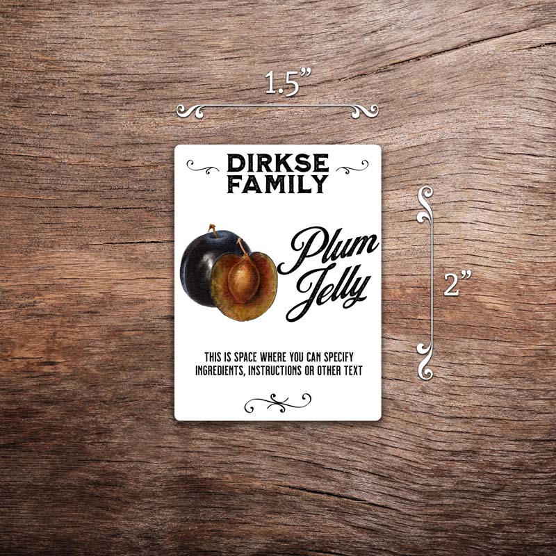 Customizable plum label featuring Italian prune plum illustrations on a white background with black text. This photo shows a rectangular label measuring 2 inches tall by 1.5 inches wide. All text on the label is customizable.