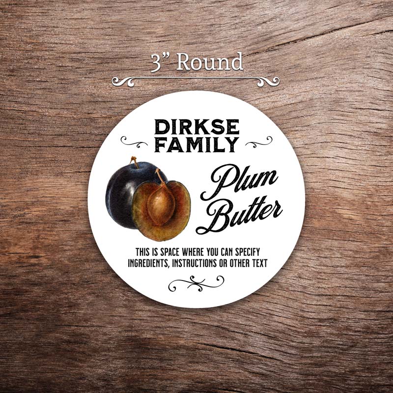 Customizable plum label featuring Italian prune plum illustrations on a white background with black text. This photo shows a round label measuring 3 inches. All text on the label is customizable.