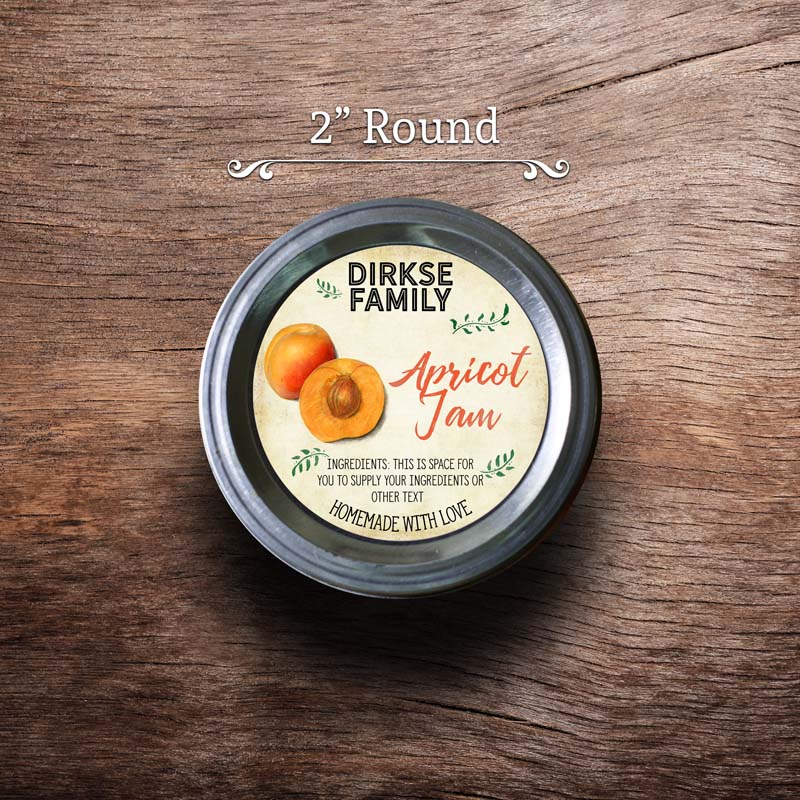 Customizable apricot label featuring apricot illustrations on a vintage paper background. This photo shows a round label measuring 2 inches. All text on the label is customizable.