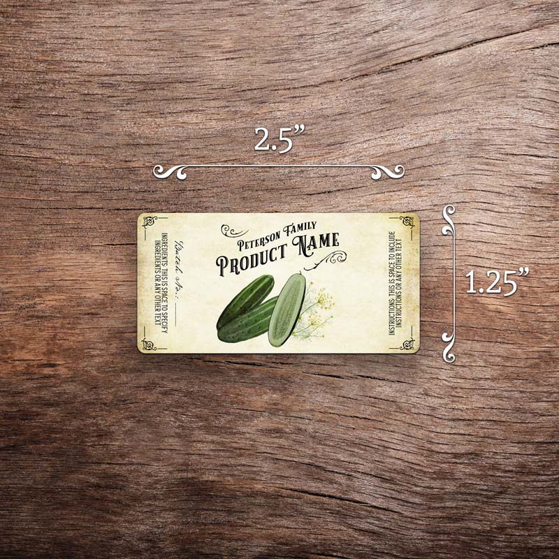 Customizable pickle label featuring cucumber and dill graphics on a vintage paper background. This photo shows a rectangular label measuring 1.25 inches tall by 2.5 inches wide. All text on the label is customizable.