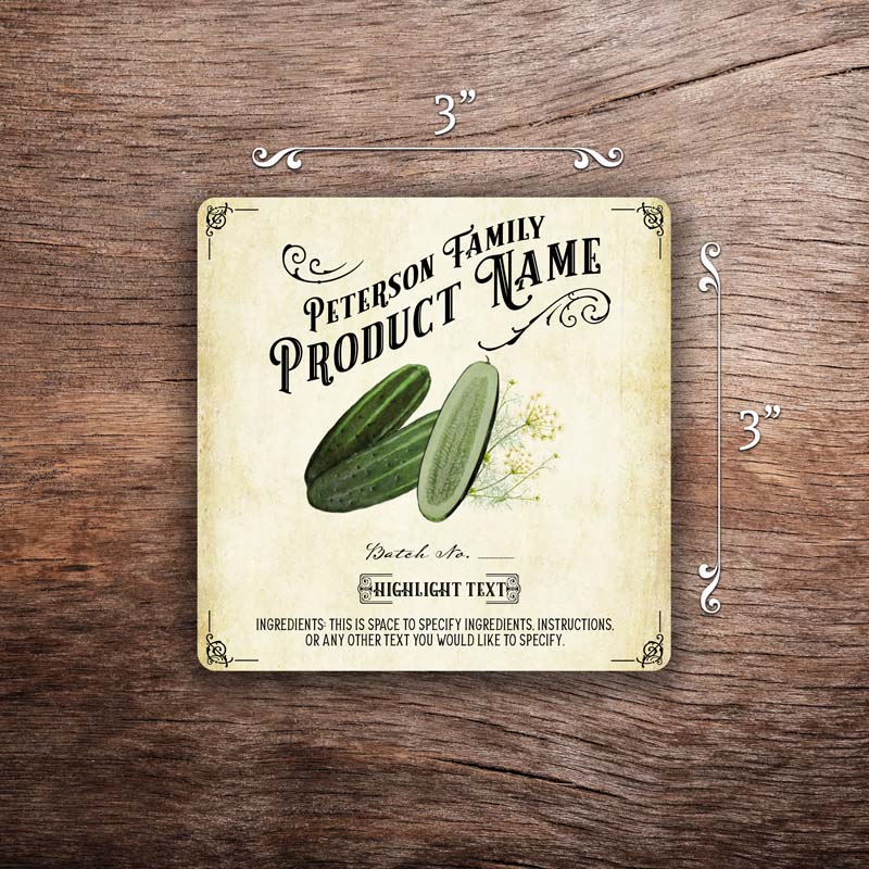 Customizable pickle label featuring cucumber and dill graphics on a vintage paper background. This photo shows a square label measuring 3 inches tall by 3 inches wide. All text on the label is customizable.