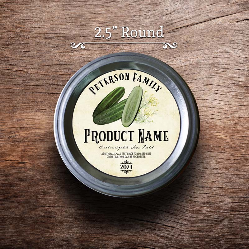 Customizable pickle label featuring cucumber and dill graphics on a vintage paper background. This photo shows a round label measuring 2.5 inches. All text on the label is customizable.