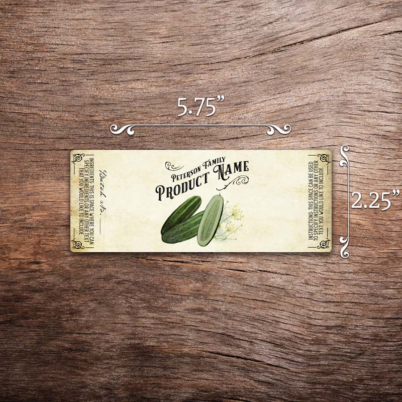 Customizable pickle label featuring cucumber and dill graphics on a vintage paper background. This photo shows a rectangular label measuring 2.25 inches tall by 5.75 inches wide. All text on the label is customizable.