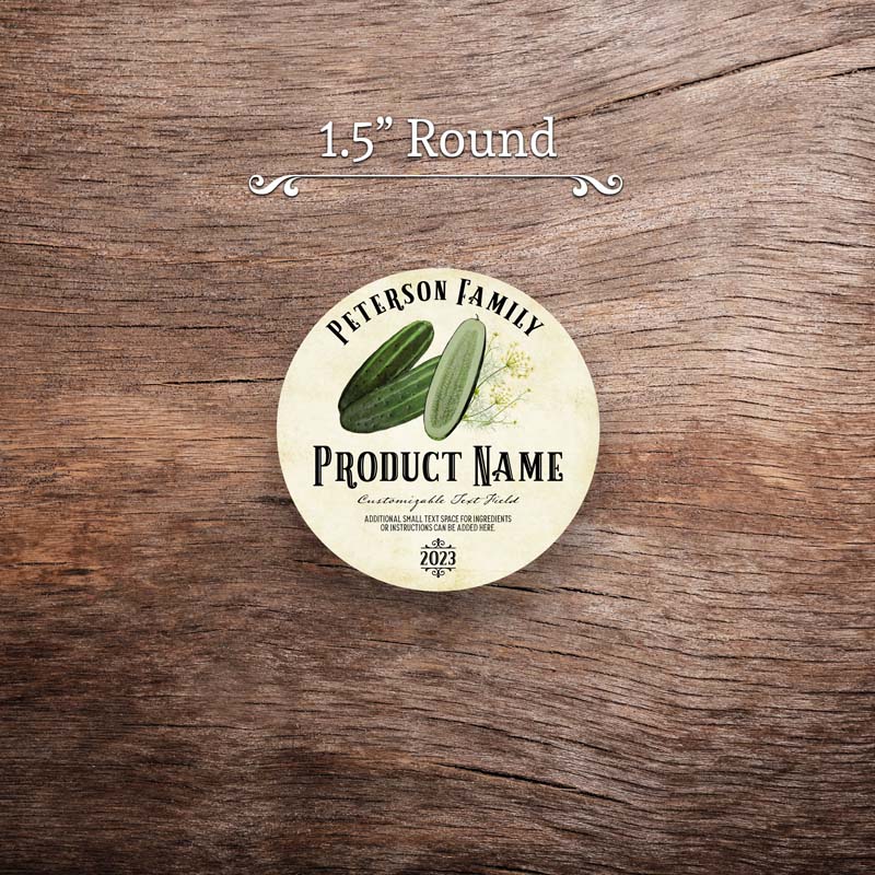 Customizable pickle label featuring cucumber and dill graphics on a vintage paper background. This photo shows a round label measuring 1.5 inches. All text on the label is customizable.