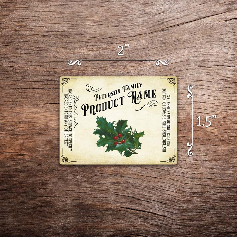 Customizable holiday label featuring holly graphics on a vintage paper background. This photo shows a rectangular label measuring 1.5 inches tall by 2 inches wide. All text on the label is customizable.