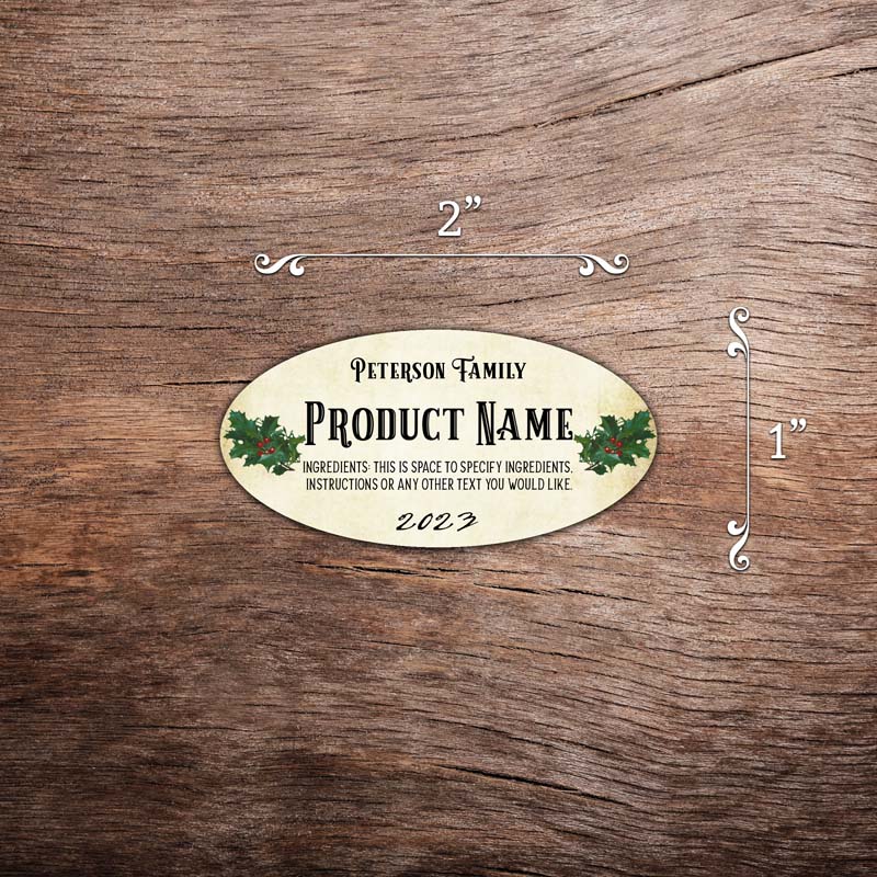 Customizable holiday label featuring holly graphics on a vintage paper background. This photo shows an oval label measuring approximately 2 inches wide by 1 inch tall. All text on the label is customizable.