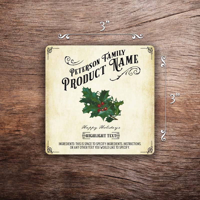 Customizable holiday label featuring holly graphics on a vintage paper background. This photo shows a square label measuring 3 inches tall by 3 inches wide. All text on the label is customizable.