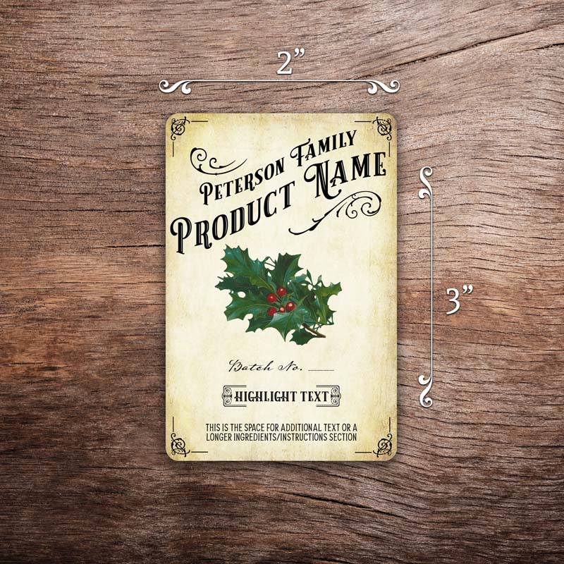 Customizable holiday label featuring holly graphics on a vintage paper background. This photo shows a rectangular label measuring 3 inches tall by 2 inches wide. All text on the label is customizable.