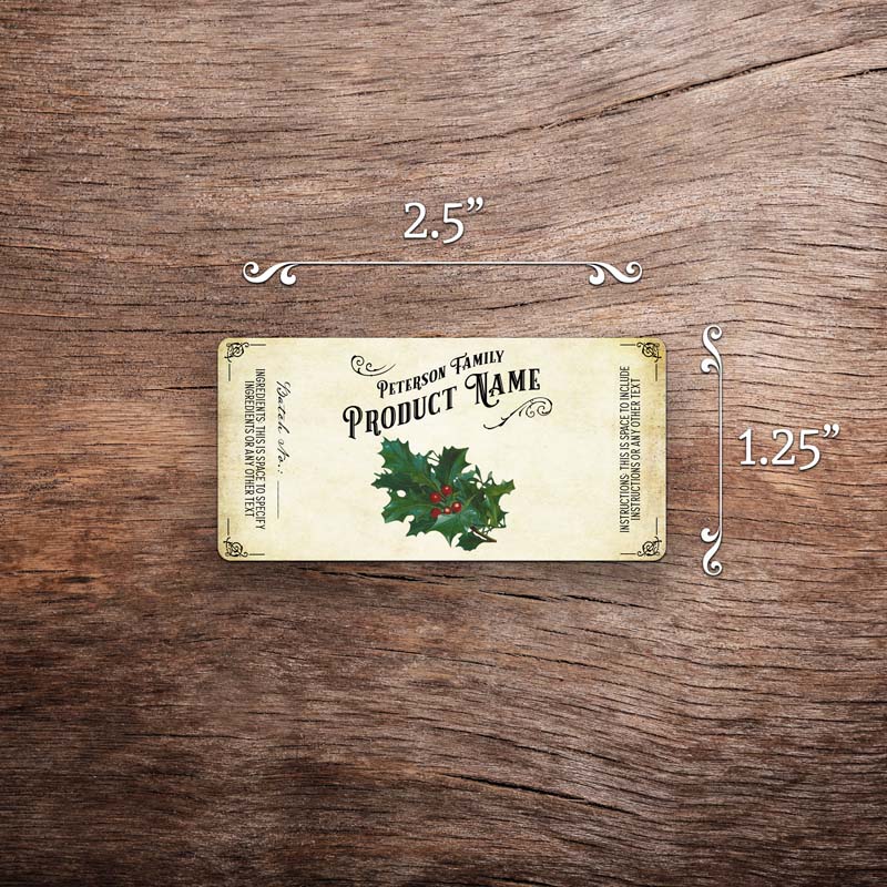 Customizable holiday label featuring holly graphics on a vintage paper background. This photo shows a rectangular label measuring 1.25 inches tall by 2.5 inches wide. All text on the label is customizable.