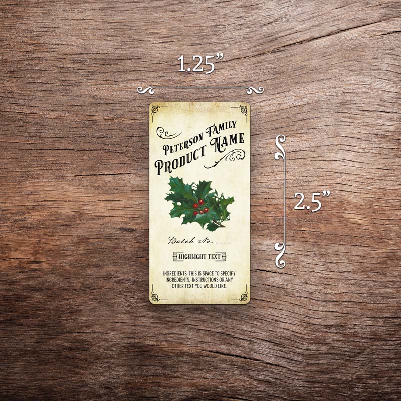 Customizable holiday label featuring holly graphics on a vintage paper background. This photo shows a rectangular label measuring 2.5 inches tall by 1.25 inches wide. All text on the label is customizable.