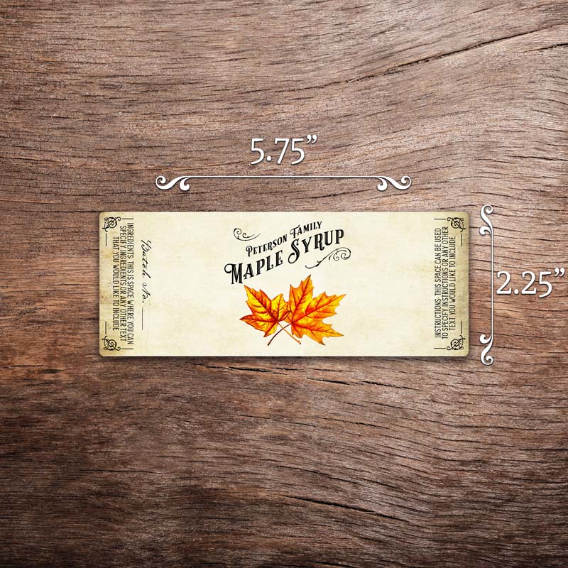 Customizable maple syrup label featuring two maple leaves on a vintage paper background. The label in this photo measures 5.75 inches tall by 2.25 inches wide. All text on the label is customizable.