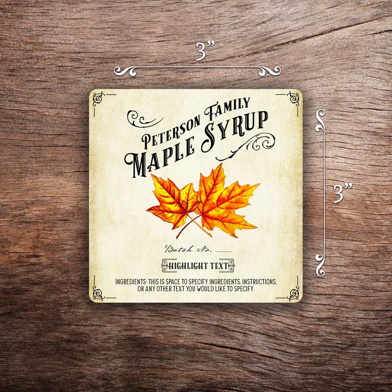 Customizable maple syrup label featuring two maple leaves on a vintage paper background. The label in this photo measures 3 inches tall by 3 inches wide. All text on the label is customizable.