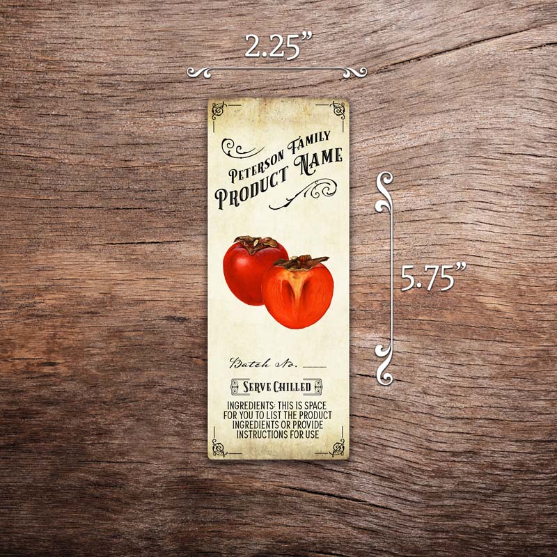 Customizable persimmon label featuring persimmon graphics on a vintage paper background. The label in this photo measures 2.25 inches tall by 5.75 inches wide. All text on the label is customizable.
