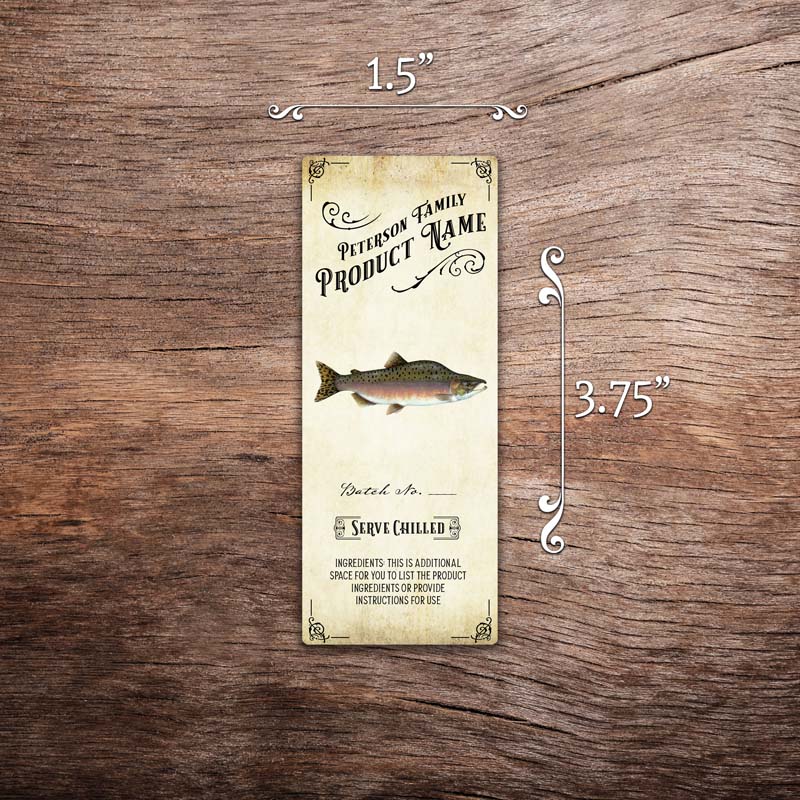 Customizable salmon label featuring an illustration of a Coho salmon on a vintage paper background. The label in this photo shows a label measuring 3.75 inches tall by 1.5 inches wide. All text on the label is customizable.