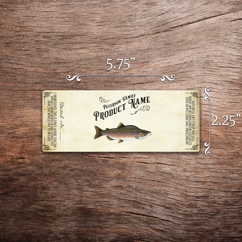 Customizable salmon label featuring an illustration of a Coho salmon on a vintage paper background. The label in this photo shows a label measuring 2.25 inches tall by 5.75 inches wide. All text on the label is customizable.