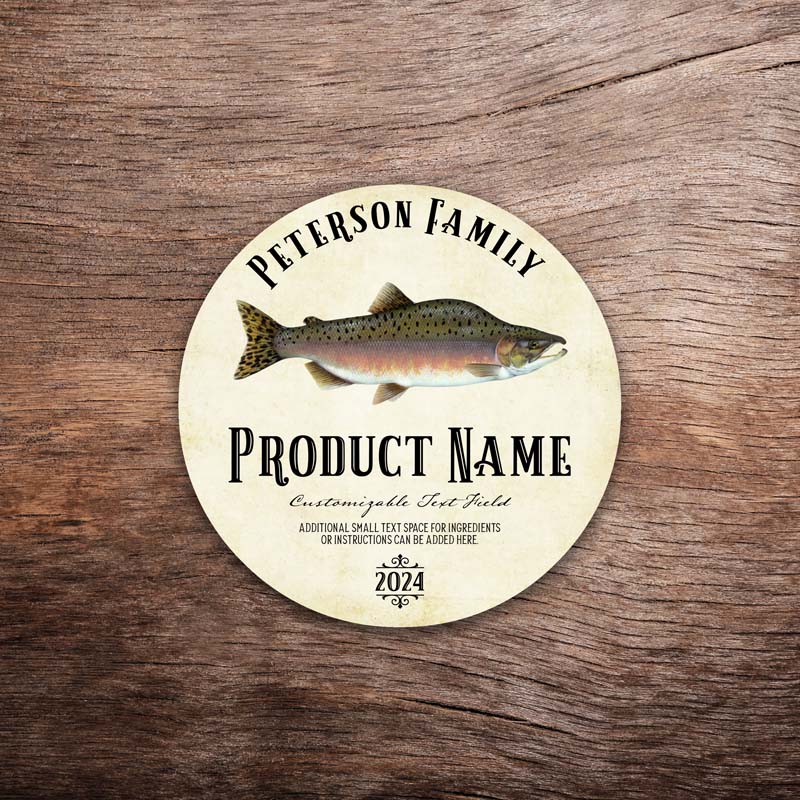 Customizable salmon label featuring an illustration of a Coho salmon on a vintage paper background. The label in this photo shows a round label. All text on the label is customizable.