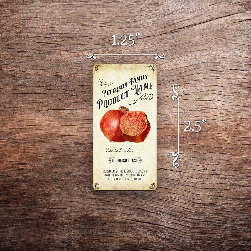 Customizable pomegranate label featuring pomegranate graphics on a vintage paper background. The label in this photo measures 1.25 inches wide by 2.5 inches tall. All text on the label is customizable.