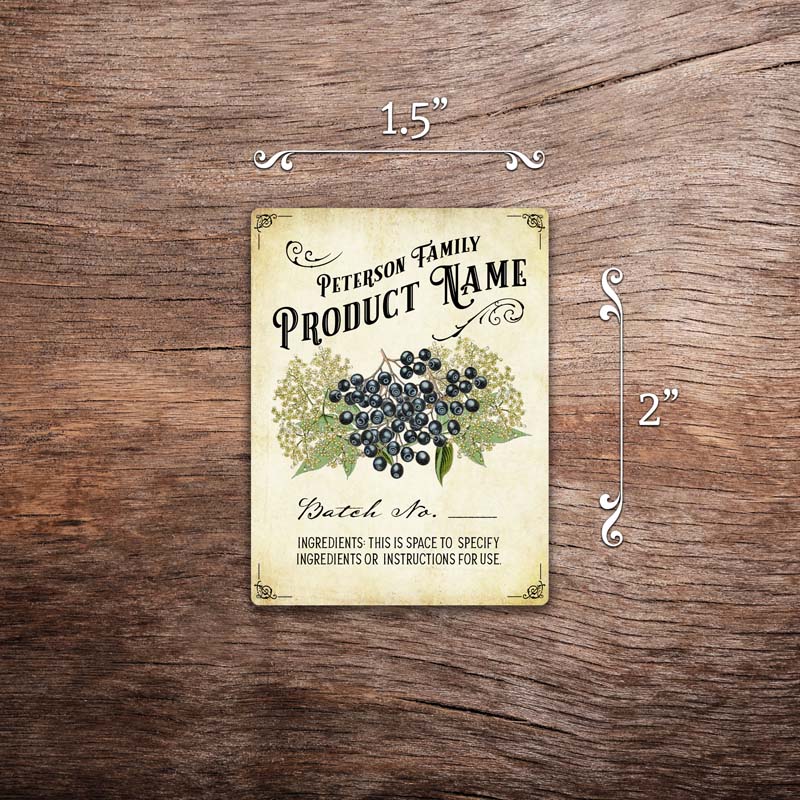 Customizable elderberry label featuring elderberry graphics on a vintage paper background. The label in this photo measures 1.5 inches wide by 2 inches tall. All text on the label is customizable.