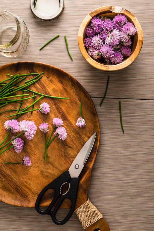 • Rinse the chive blossoms and gently pat them dry with paper towels.