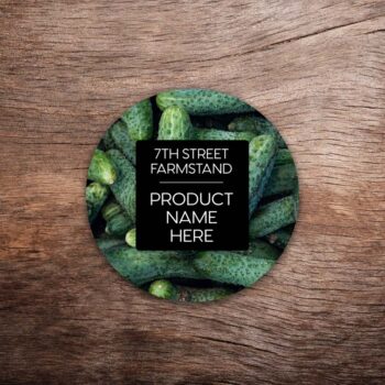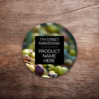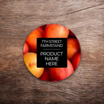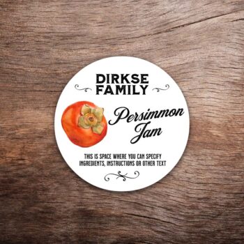 • Customizable persimmon label featuring persimmon illustrations on a white background with black text. This photo shows a round label. All text on the label is customizable.