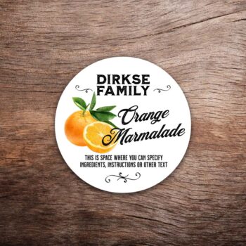 • Customizable orange label featuring watercolor orange illustrations on a white background with black text. This photo shows a round label. All text on the label is customizable.
