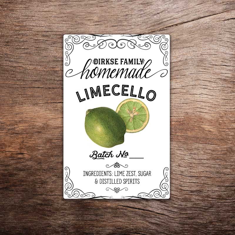 Our customized limecello labels will add a vintage flair and a professional look to your homemade spirits. The label design features vintage lime illustrations, and you can customize the text and the logo/name space, either by customizing the text or supplying your own logo if you have one.