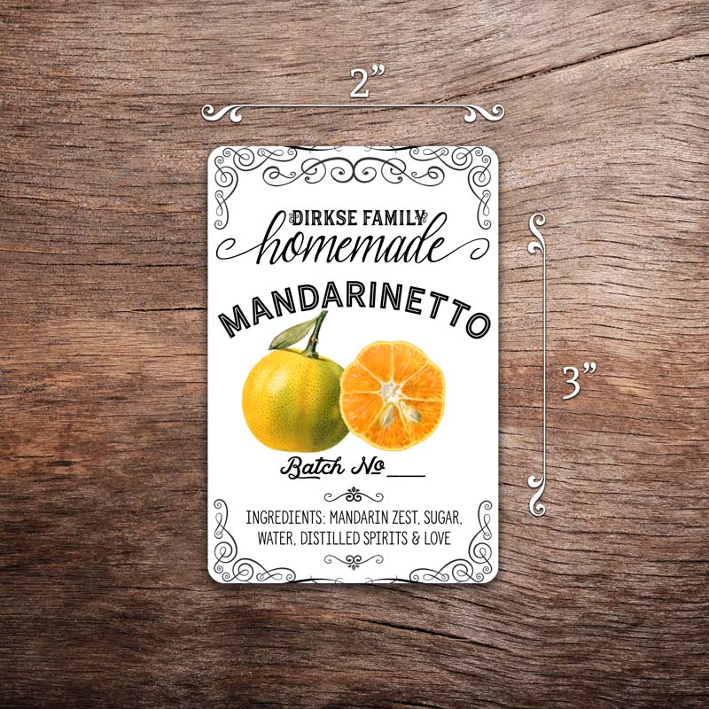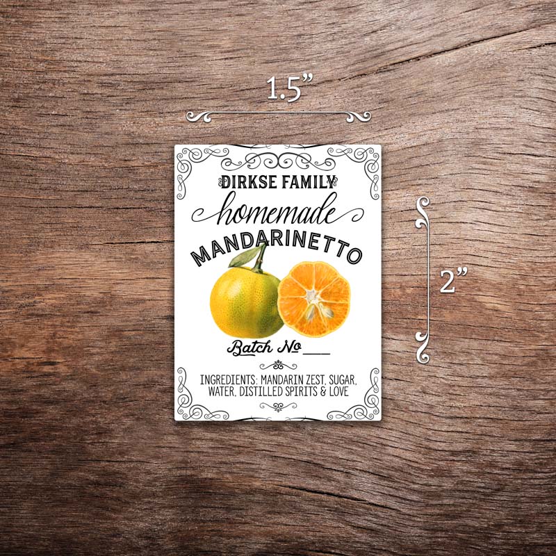 Our customized mandarinetto labels will add a vintage flair and a professional look to your homemade spirits. The label design features vintage mandarin illustrations, and you can customize the text and the logo/name space, either by customizing the text or supplying your own logo if you have one.