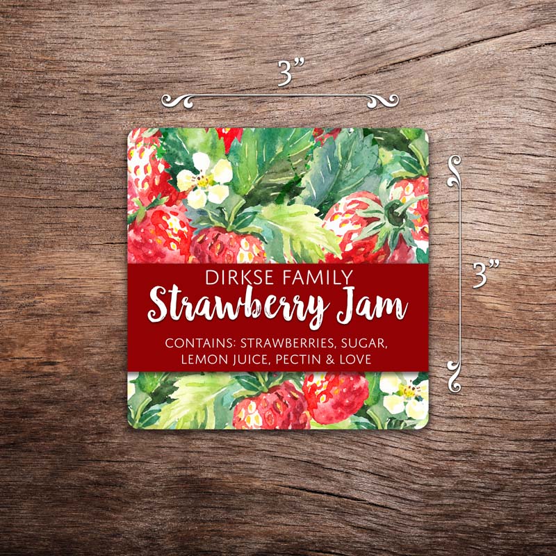 These watercolor-style strawberry canning labels are customizable for your own cellar. This label features watercolor strawberries. They’re perfect for labeling your homemade strawberry jam or strawberry jelly.