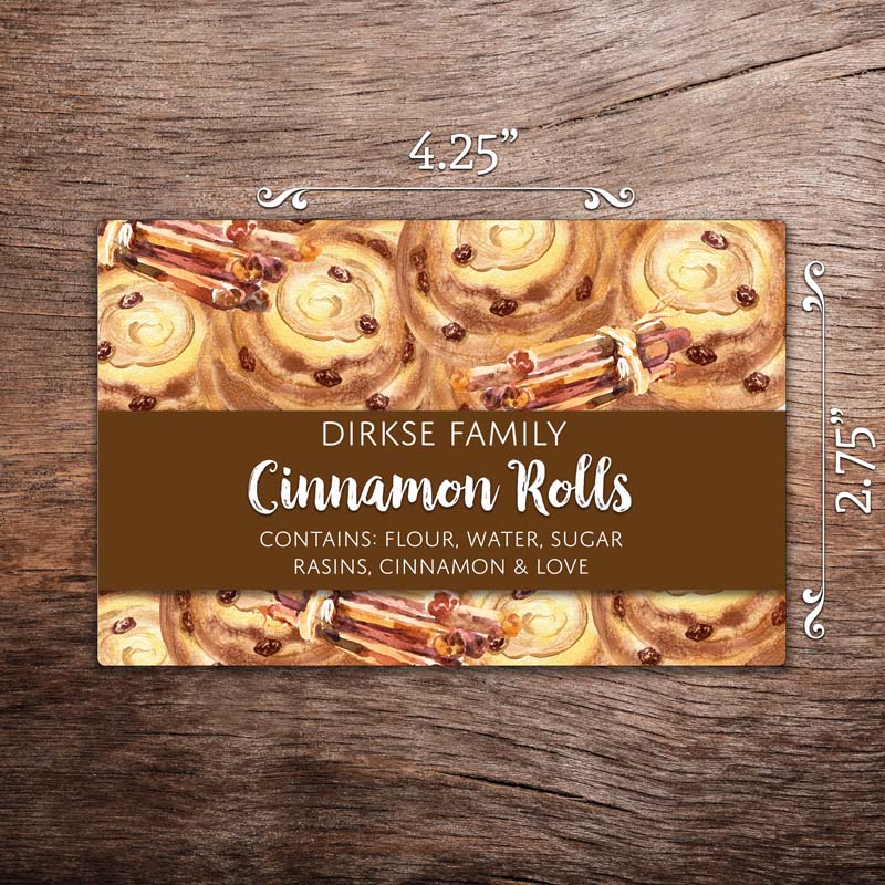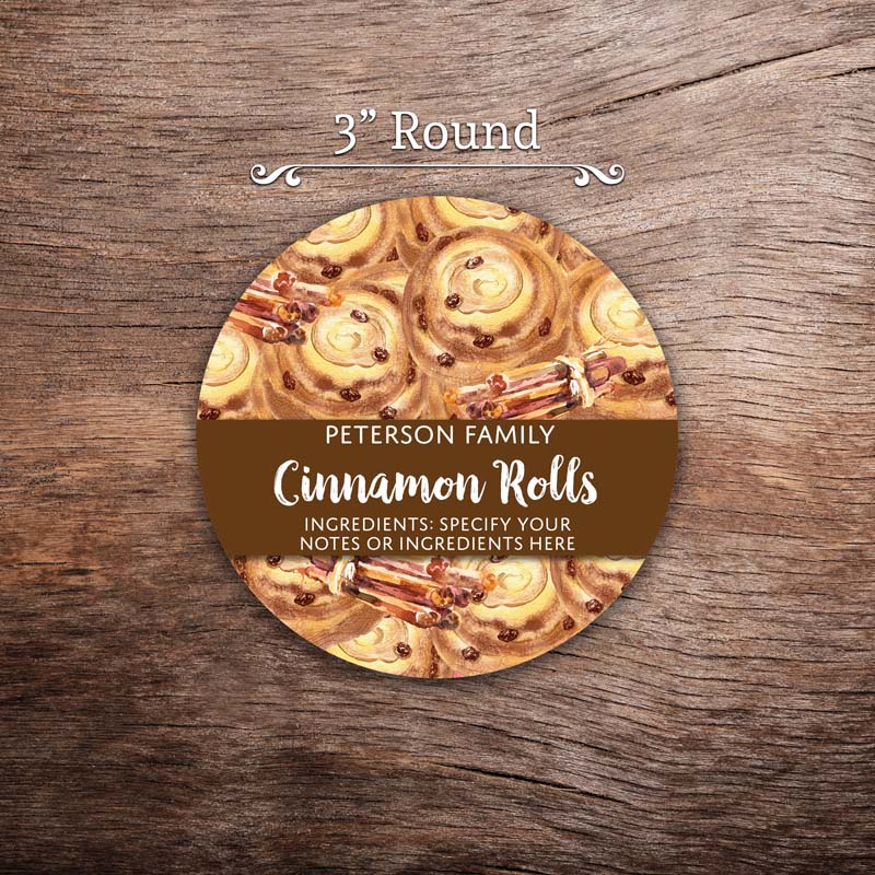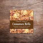 These watercolor-style cinnamon roll labels are customizable for your own homemade baked goods. This label features watercolor cinnamon buns and cinnamon sticks. They’re perfect for labeling your homemade cinnamon rolls, bakery bags and boxes..