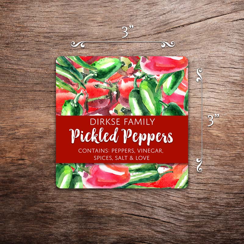 These watercolor-style pickled peppers canning labels are customizable for your own cellar. This label features watercolor peppers. They’re perfect for labeling your homemade pickled peppers, frozen peppers or hot sauce.