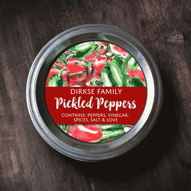 These watercolor-style pickled peppers canning labels are customizable for your own cellar. This label features watercolor peppers. They’re perfect for labeling your homemade pickled peppers, frozen peppers or hot sauce.