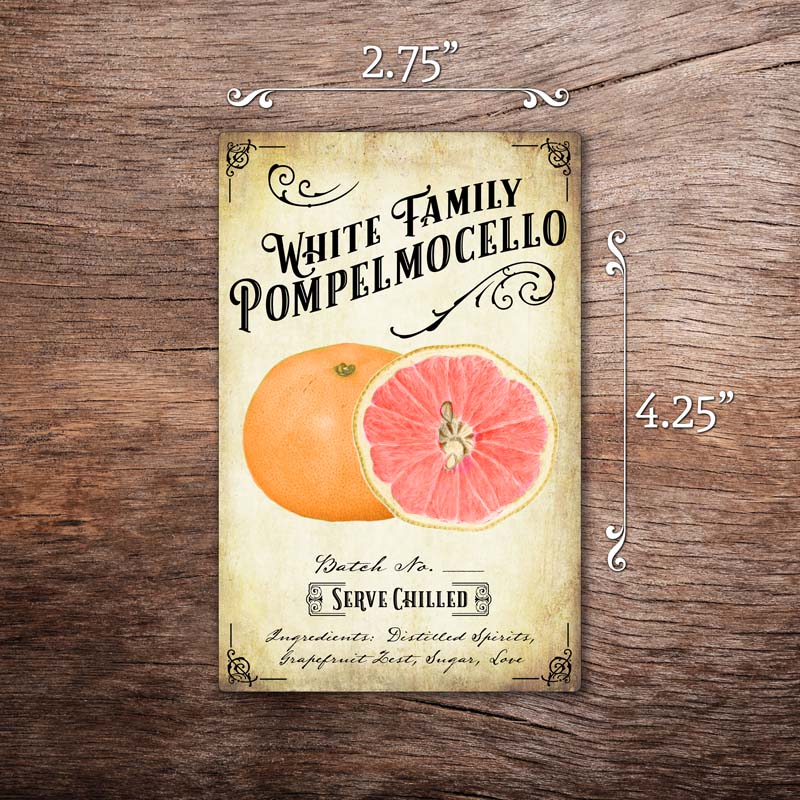Add a vintage flair and professional look to your homemade spirits with these vintage-style Pompelmocello labels! This fully customizable label design features vintage grapefruit illustrations on an aged paper background. Any of the text can be customized, and we’re always happy to add additional text or your logo to the label.