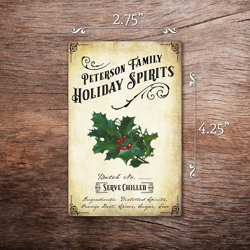 Add a holiday flair and professional look to your homemade spirits with these vintage-style liqueur labels! These customizable labels feature vintage holly illustrations and an aged paper background. All text on the label is customizable, and we are happy to add additional text or your logo too.