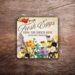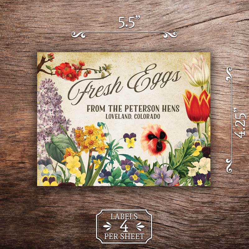 Our customizable egg carton labels let you create beautiful, custom half-dozen cartons for your eggs. This design is vintage style featuring spring flowers and is customizable with your farm name and other text elements. Do you need specialized information added to the carton? Just let us know in the comments when you order. We print these labels on our premium, water resistant label stock, with archival inks on our professional printer. The beautiful black and color saturation, as well of the smooth finish of these labels, will bring a professional look to even the smallest backyard egg operation!